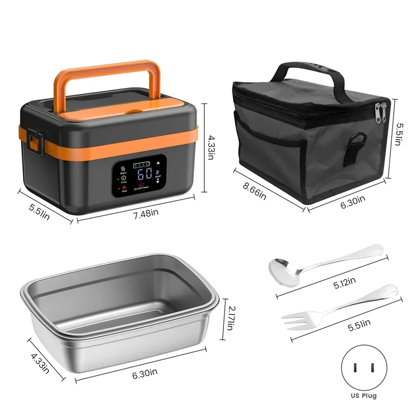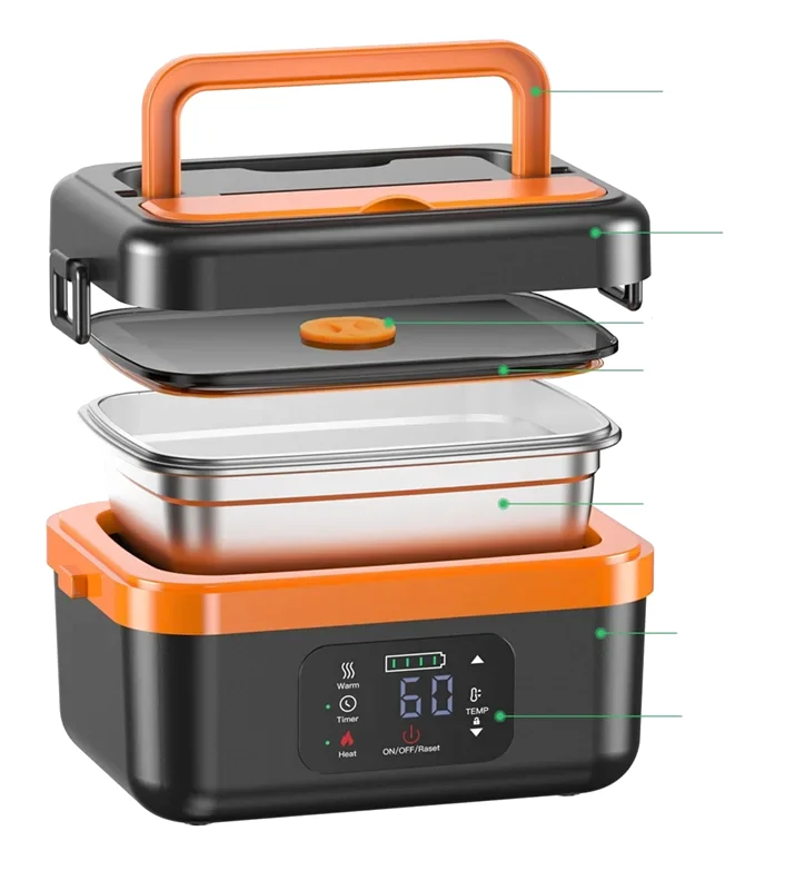 Cette lunch box chauffante sans fil se distingue par son autonomie et ses fonctionnalités avancées. Contrairement aux simples boîtes chauffantes à brancher sur secteur ou allume-cigare, elle vous offre une liberté totale grâce à sa batterie rechargeable de 16 000mAh. Avec son design robuste noir & orange, son sac isolant et ses accessoires pratiques, elle est pensée pour ceux qui travaillent sur la route, en extérieur ou qui n’ont pas toujours accès à un micro-ondes.